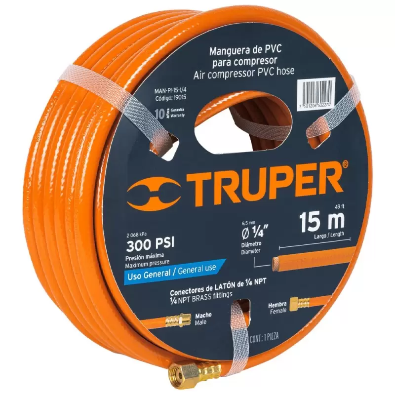 La Manguera Armada 1/4″ P/Pintor 15 MTS. 19015 Truper es un producto diseñado para ofrecer máxima resistencia y durabilidad en tareas que requieren herramientas neumáticas. Fabricada con PVC 100% virgen, esta manguera asegura un desempeño robusto incluso en condiciones exigentes, destacándose por su capacidad de soportar una presión máxima de 300 PSI (2,068.5 Kpa). Estas especificaciones hacen de este producto una opción confiable para profesionales y aficionados a la pintura o trabajos industriales.